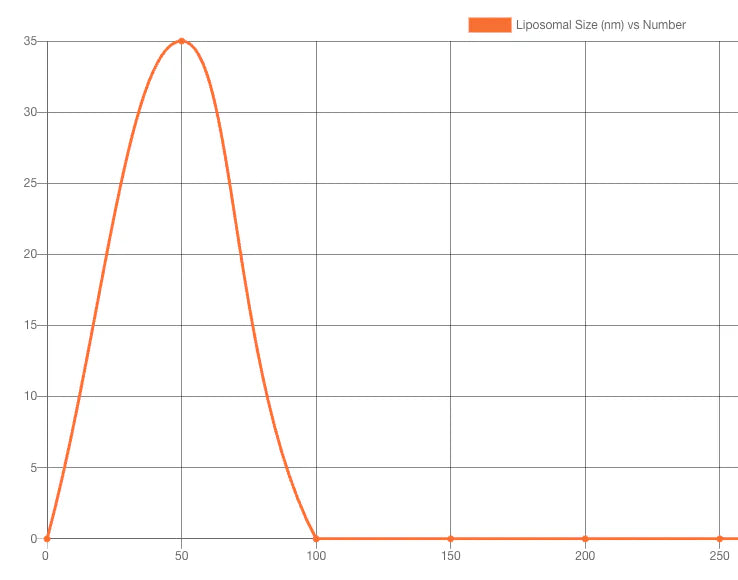 Here is a typical analysis of a Rho liposomal product. The particle size post-digestion is determined using Dynamic Light Scattering (DLS). This data remains relatively consistent across our product range. While TEM (Transmission Electron Microscopy) images of individual liposome structures are intriguing, what truly matters is ensuring the right type of particles throughout the entire product.